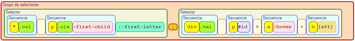 . Cuando aún no hemos practicado lo suficiente con selectores puede ser duro de entender hasta que vayamos adquiriendo soltura con estas expresiones. En el esquema vemos un grupo de selectores formados por dos selectores. El primero tiene dos secuencias de selectores simples separados por el combinador espacio y finalizado con un pseudo-elemento. Una secuencia es una cadena de selectores simples, siempre empezando con una selector simple tipo o universal, luego puede tener cero o más selectores simples que no sean de tipo o universal. Las partes de la secuencia no pueden llevar ningún espacio entre ellas. El pseudo-elemento, que siempre estará al final del selector, se separa con doble dos puntos (::) en CSS3 pero en CSS2-1 se separa con dos puntos (:). Esto se hizo para diferenciar los pseudo-elementos de las pseudo-clases, aunque aún siguen funcionando los pseudo-elementos con sólo dos puntos (:) para los ya existentes en CSS2-1 (:first-line, :first-letter, :before, :after