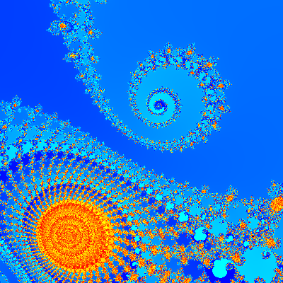 Espero seguir mejorando algunos aspectos, como disminuir los tiempos de proceso para que se genere más rápidamente el fractal. De todas formas para un plano de 400×400 píxeles suponen un total de 160000 iteraciones de los bucles exteriores (resaltado en amarillo), a las que hay que sumar las de escape del bucle seleccionador (en verde). Por ejemplo, con un valor de escape 30 para el Conjunto Julia en (-0.75,0) obtenemos 1384204 iteraciones en total. En mi ordenador esto lleva unos 5 segundos con Chrome 17.0. El asunto estaría en reducir los tiempos de cálculo matemático y otros procesos como la gestión de colores.